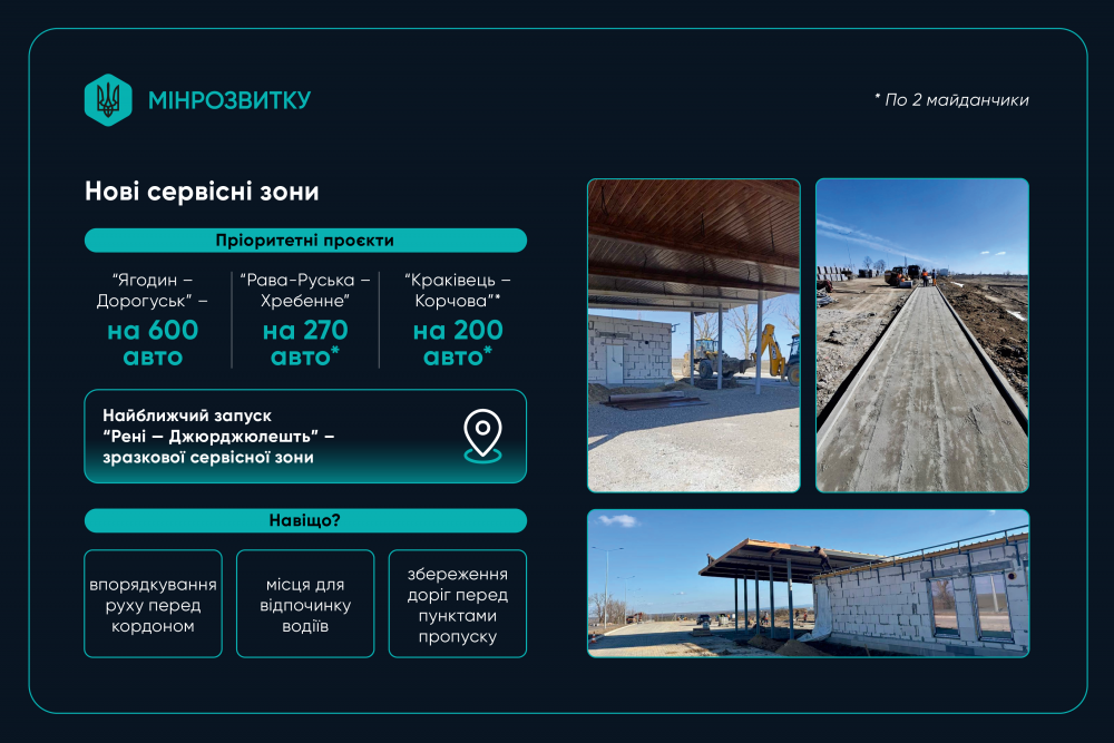Паралельно розвивається інфраструктура для очікування та обслуговування вантажного транспорту перед кордоном. У 2026 році будуються або розширюються сервісні зони: