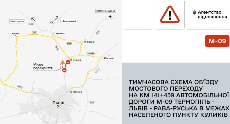 Початок дії обмеження руху заплановано на 10:00 27 квітня 2026 року. Це пов’язано з проведенням ремонтних робіт на мостовому переході, розташованому на автомобільній дорозі державного значення М-09 Тернопіль – Львів – Рава-Руська (м. Люблін) км 141+459, в межах селища Куликів.