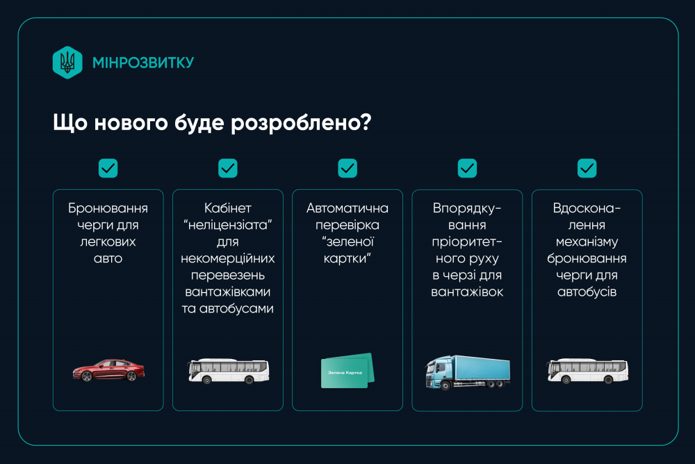 У рамках масштабного оновлення системи заплановано ряд нових опцій. Зокрема, система буде автоматично перевіряти наявність страхового поліса "Зелена карта" при бронюванні місця в черзі. Користувачу буде достатньо ввести номер транспортного засобу.
