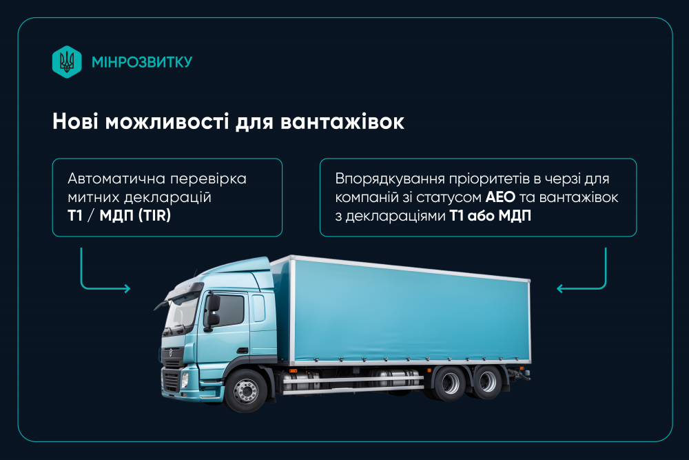 Для вантажного транспорту при бронюванні можна буде вказувати митні документи Т1 або книгу МДП (TIR). Їх дія буде перевірятися автоматично через інтеграцію з відповідними інформаційними системами. Також система передбачатиме пріоритет в черзі для окремих категорій перевізників і вантажів - зокрема, для компаній зі статусом АЕО (авторизований економічний оператор) або для перевезень з митними деклараціями Т1 і книгами МДП.
