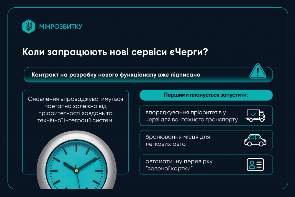 Починається розробка нового функціоналу системи єЧерга, яка розширить її використання для легкових автомобілів і оновить можливості для комерційного транспорту - вантажівок і автобусів. Про це Ларді.Today дізнався з повідомлення Міністерства розвитку громад та територій України.