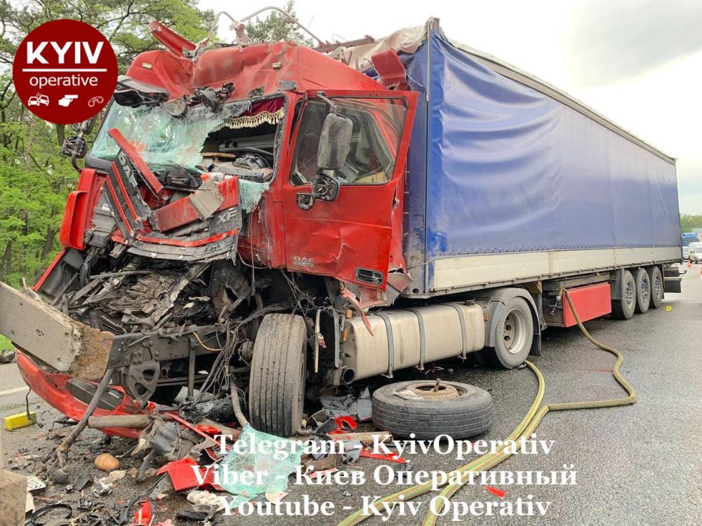 В сообщении говорится, что на светофоре в направлении Киева один за другим стояло несколько грузовых автомобилей. В какой-то момент все участники инцидента, которых оказалось больше пятидесяти человек, почувствовали сильный удар сзади. Впоследствии выяснилось, что в очередь автомобилей врезалась фура DAF (на фото с красной кабиной), которая пострадала сильнее остальных машин.